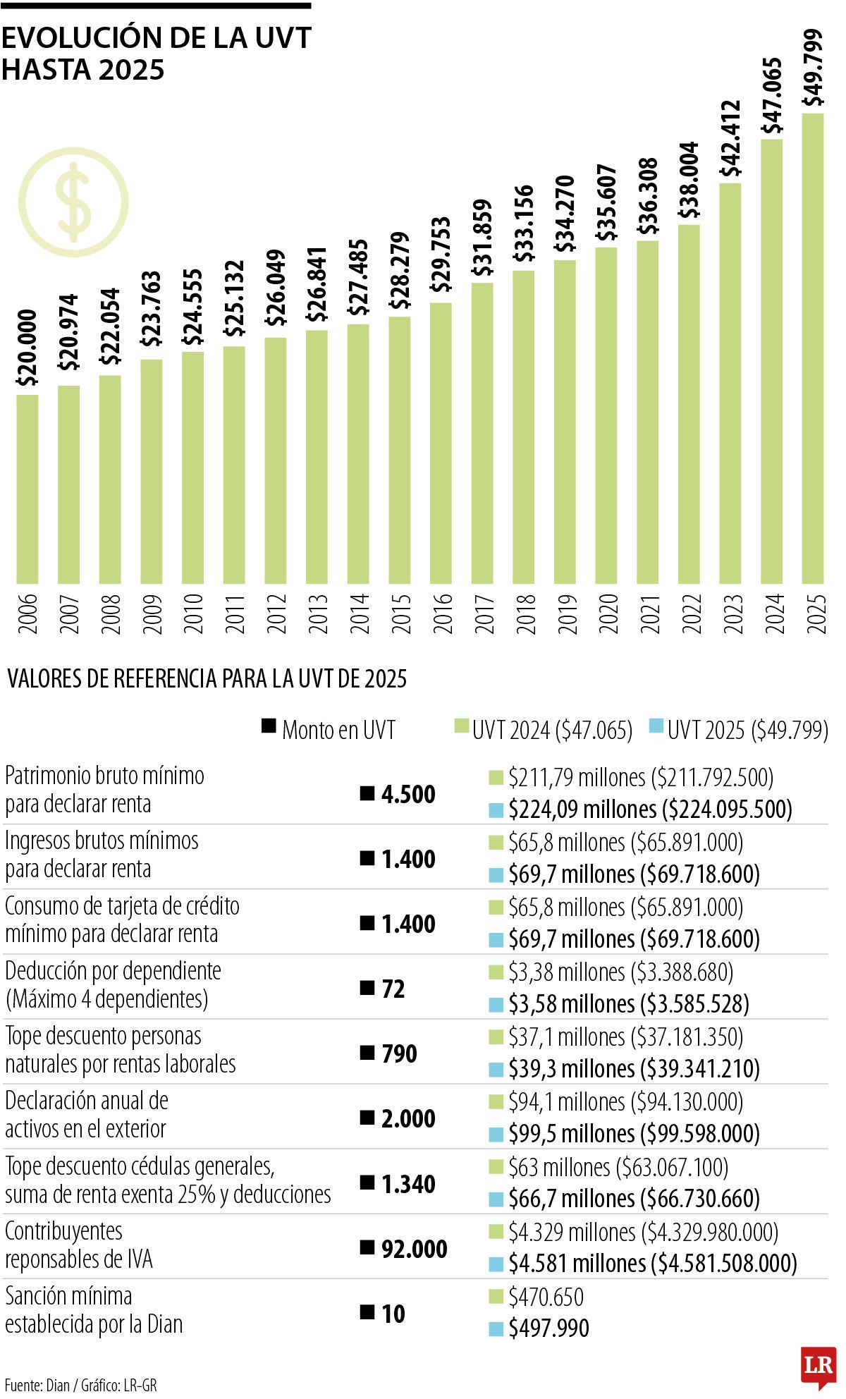 Las UVT también fijan las sanciones que aplican para las personas que incumplan con el pago de impuestos o cometan errores en su declaración. La sanción mínima establecida por la Dian es de 10 UVT, por lo que asciende desde $470.650 este año a $497.990 en 2025.