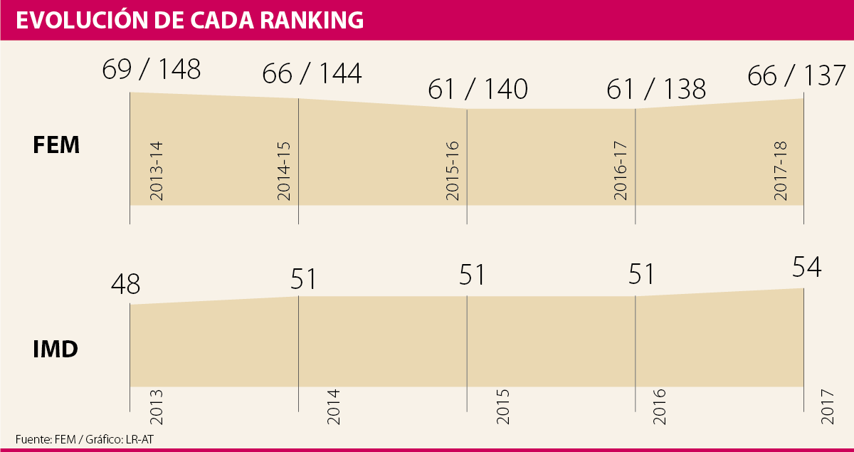Hay que tener en cuenta que el FEM mide 137 países, mientras que el IMD solo tiene en su medición 63 naciones, lo que se traduciría en un peor desempeño del país en este segundo ranking.