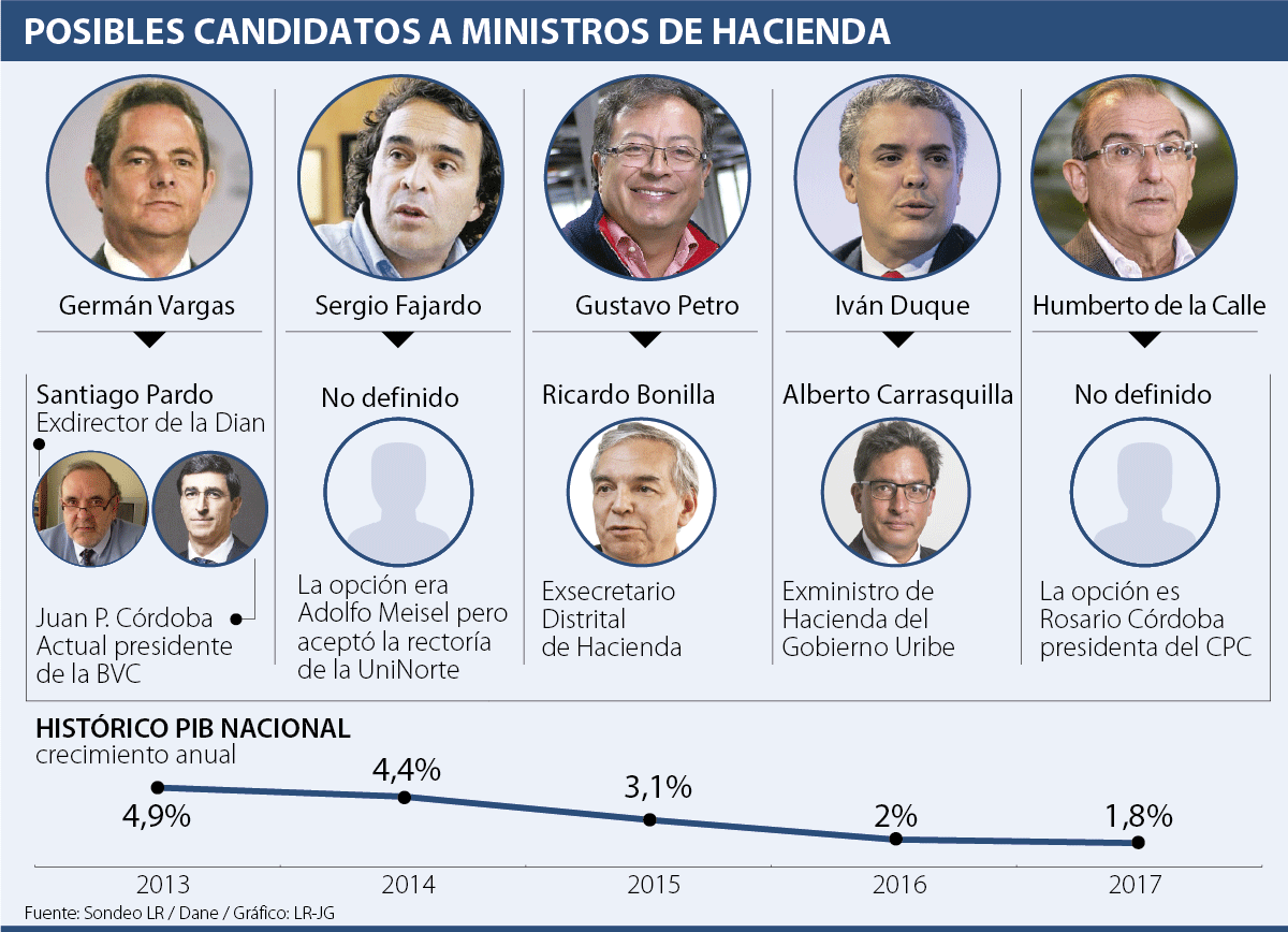 El próximo 27 de mayo se llevarán a cabo en Colombia las votaciones para elegir el nuevo presidente, por lo que AL quiso consultar con los cinco candidatos sus posibles opciones para ministro de Hacienda, teniendo en cuenta que es una de las carteras más importantes para el curso de la economía los próximos cuatro años.