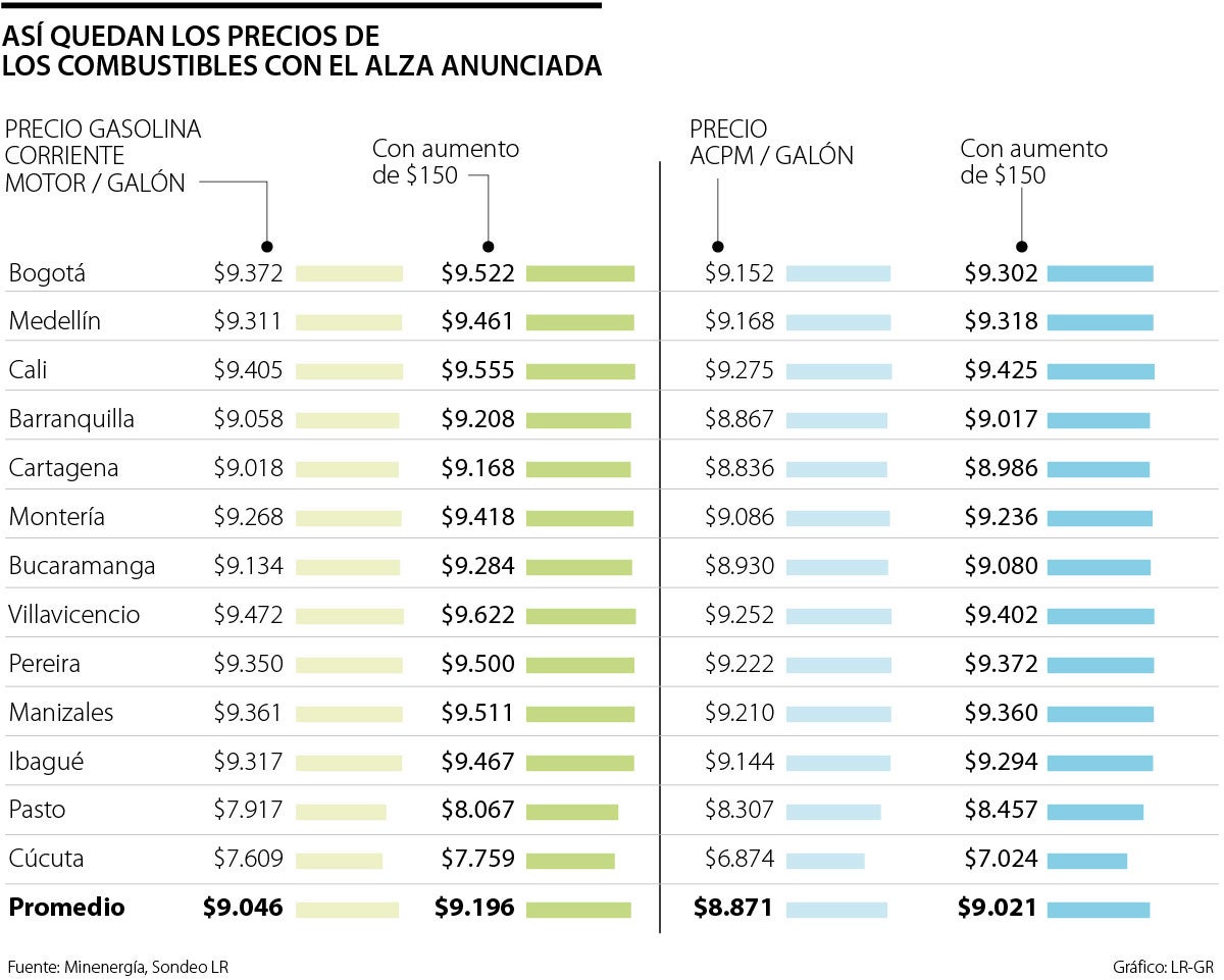 Con esta subida en los precios, las 13 ciudades principales del país verán un precio de $9.180 en gasolina y $9.018 en diésel