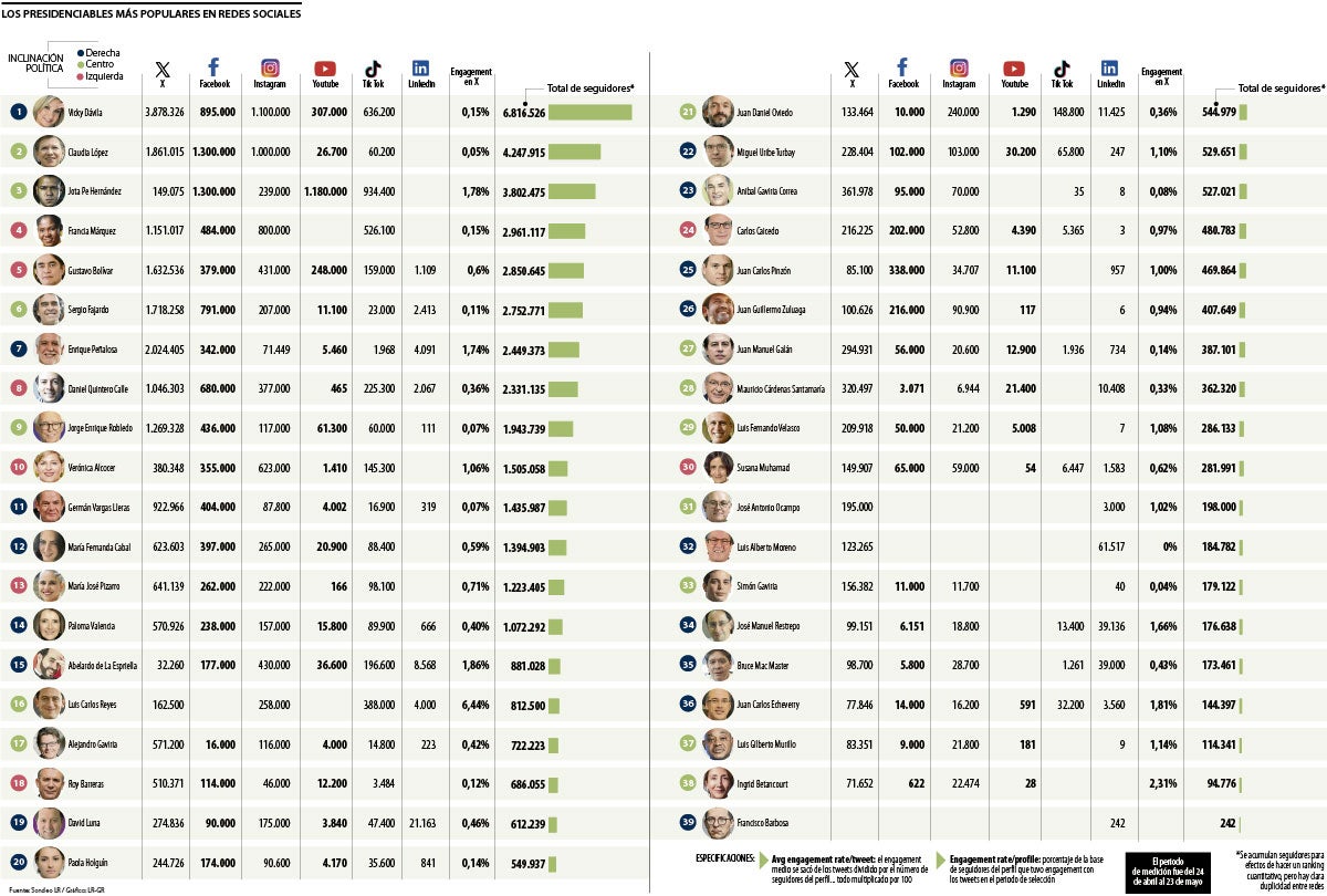 La lista la componen otros 39 nombres, entres los que destacan por su presencia en redes María Fernanda Cabal, María José Pizarro, Paloma Valencia, Abelardo de La Espriella, Roy Barreras, David Luna, Paola Holguín, Juan Daniel Oviedo, Miguel Uribe Turbay y Aníbal Gaviria Correa.