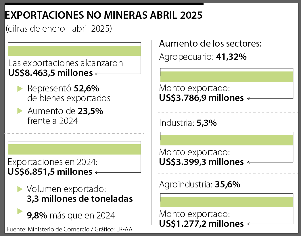 Las exportaciones hasta el cuarto mes del año alcanzaron US$8.463,5 millones en productos agropecuarios, agroindustriales e industriales, es decir bienes no minero energéticos. Del total de bienes exportados, estos productos representaron 52,6%, más de la mitad de las exportaciones, aumentando nueve puntos porcentuales en comparación con el mismo periodo del año pasado.