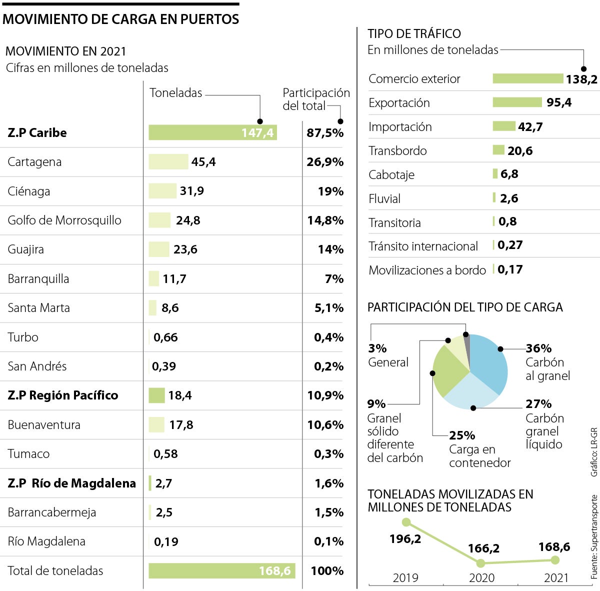 El año pasado Colombia movilizó 168,6 millones de toneladas por los puertos del país, una cifra que representó una recuperación de 1,4% frente 2020, el primer año de pandemia, cuando la cifra de mercancía por estas terminales totalizó 166,2 millones de toneladas, según informó la Superintendencia de Transporte en el informe anual del sector portuario.