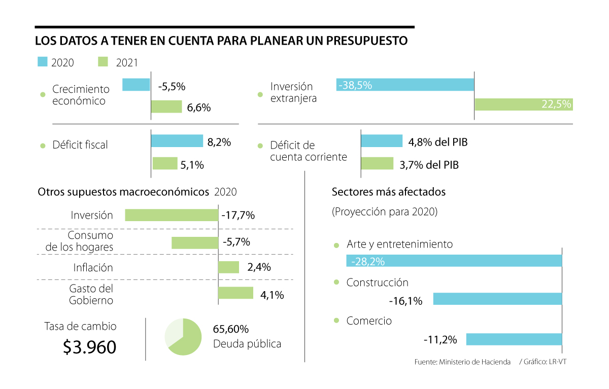 En ese sentido, las proyecciones más importantes del Gobierno para este y el próximo año son las siguientes: el PIB caerá 5,5% en 2020 y en 2021 habrá un rebote a 6,6%; la inversión extranjera también bajará 38,5% y subirá 22,5%, respectivamente; el déficit en cuenta corriente (diferencia entre importaciones y exportaciones) subirá este año a 4,8% del PIB, pero en 2021 se recuperará a 3,7%.