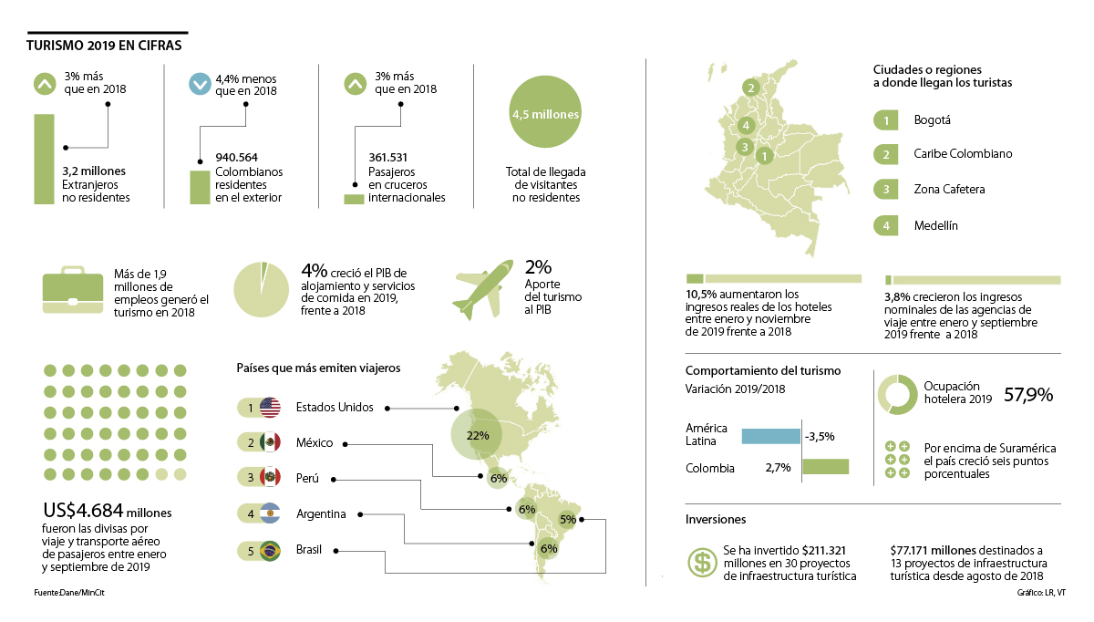Siguen llegando resultados económicos e indicadores de la vigencia de 2019 que miden el estado actual de la economía nacional. Ayer el turno fue para el turismo, que reportó cifras récord durante el año anterior al registrar un total de 4,51 millones de llegadas de visitantes no residentes al país, según cálculos entregados por el Ministerio de Comercio, Industria y Turismo (MinCit).
