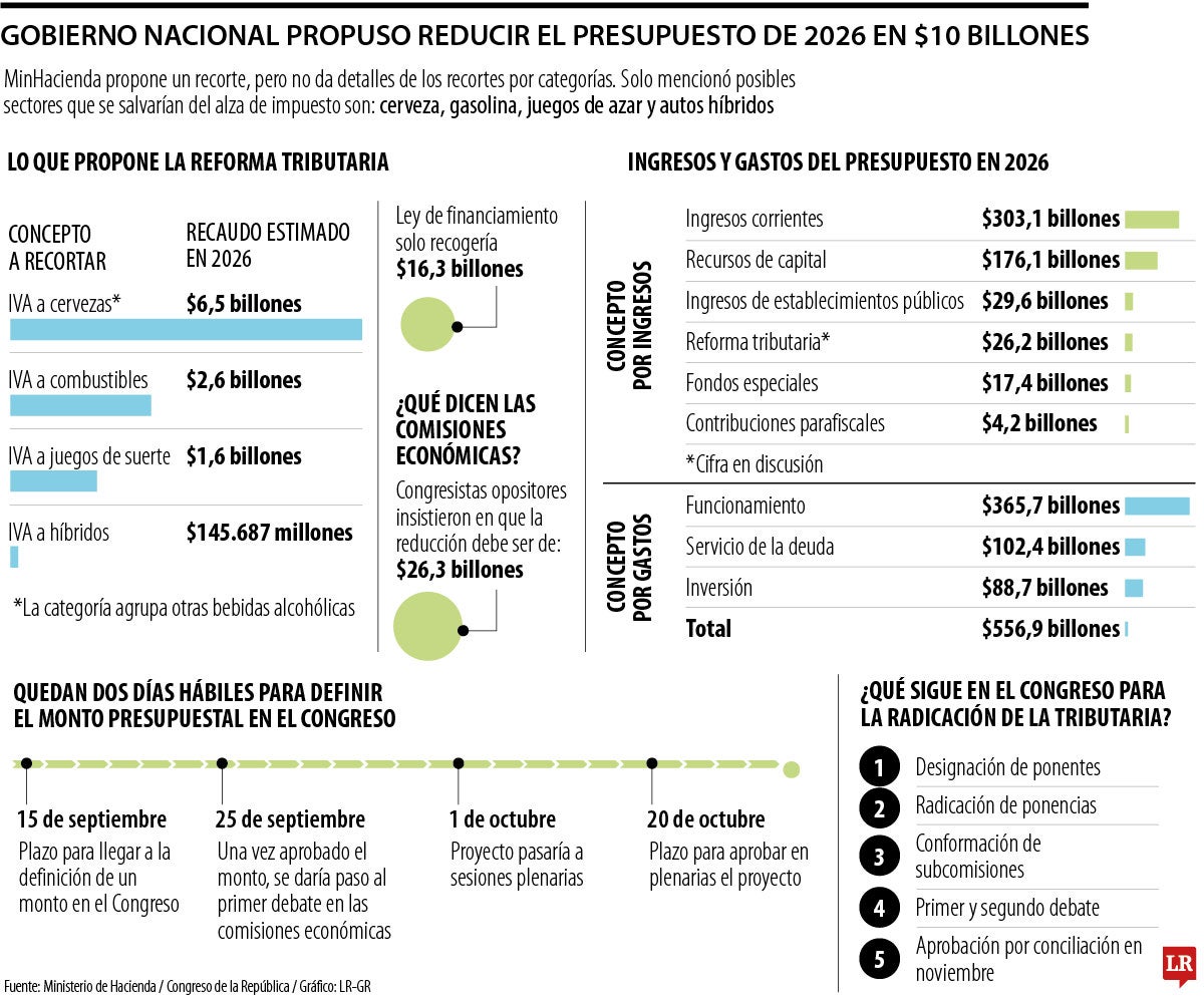 Ni Ávila ni Castellanos precisaron las cifras discriminadas bajo las cuales se recortarían $10 billones. Pero ambos señalaron los rubros que permitirían el recorte: IVA a las cervezas, que en la proyección de recaudo de 2026, integrado con otros licores, dejaría $6,5 billones; IVA a la gasolina y al diésel ($2,6 billones); IVA a juegos de suerte y azar ($1,6 billones); e IVA a vehículos híbridos ($145.687 millones).