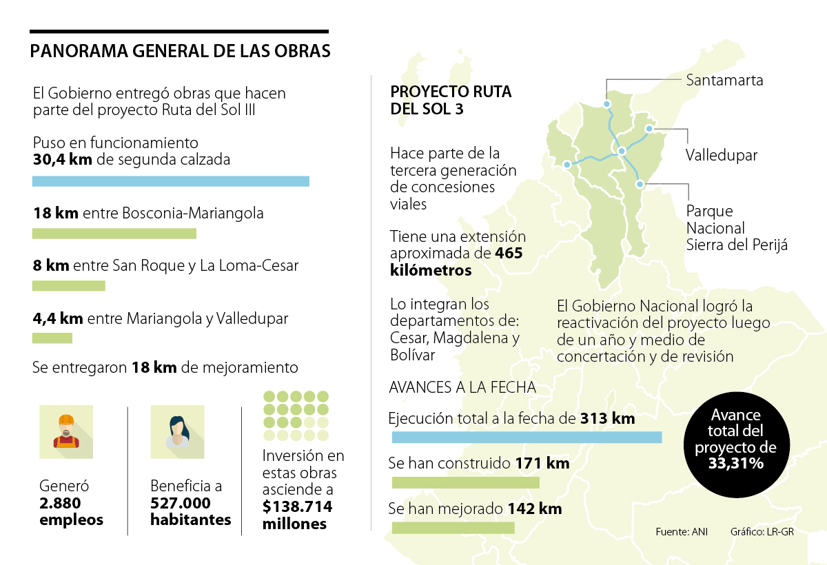 Tras la reactivación de las obras del proyecto Ruta del Sol III en febrero y luego de estar paralizadas por casi tres años debido a problemas financieros del concesionario Yuma S.A., el presidente de la República, Iván Duque, entregó, en Bosconia, Cesar, 48 kilómetros de vías, 30,4 km de segunda calzada nueva y 18 km de mejoramiento.