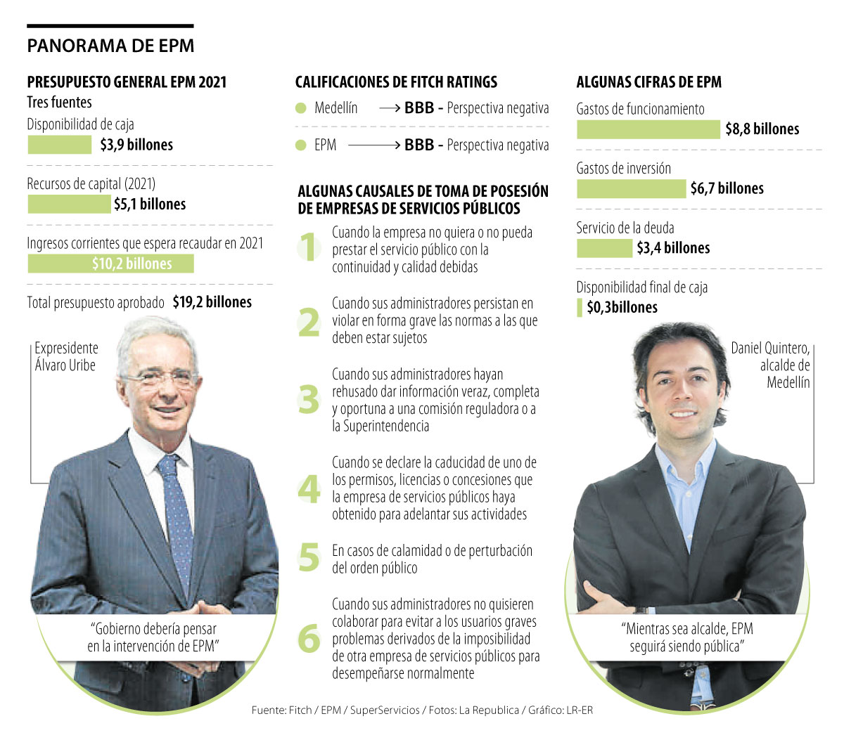 Esto fue interpretado por Uribe como un riesgo inminente de que la compañía pierda el grado de inversión. Sin embargo, el presidente Duque fue claro en señalar que “no existe hoy causal de toma de posesión de la empresa, ni existen causales de intervención; hacer una intervención sin causa sería ir en contra de la ley 142 porque no hay una falla en la prestación del servicio”. Además, agregó que, de hacer una intervención “podría ser inclusive peor el remedio que la enfermedad” e instó a EPM a fortalecer el gobierno corporativo.
