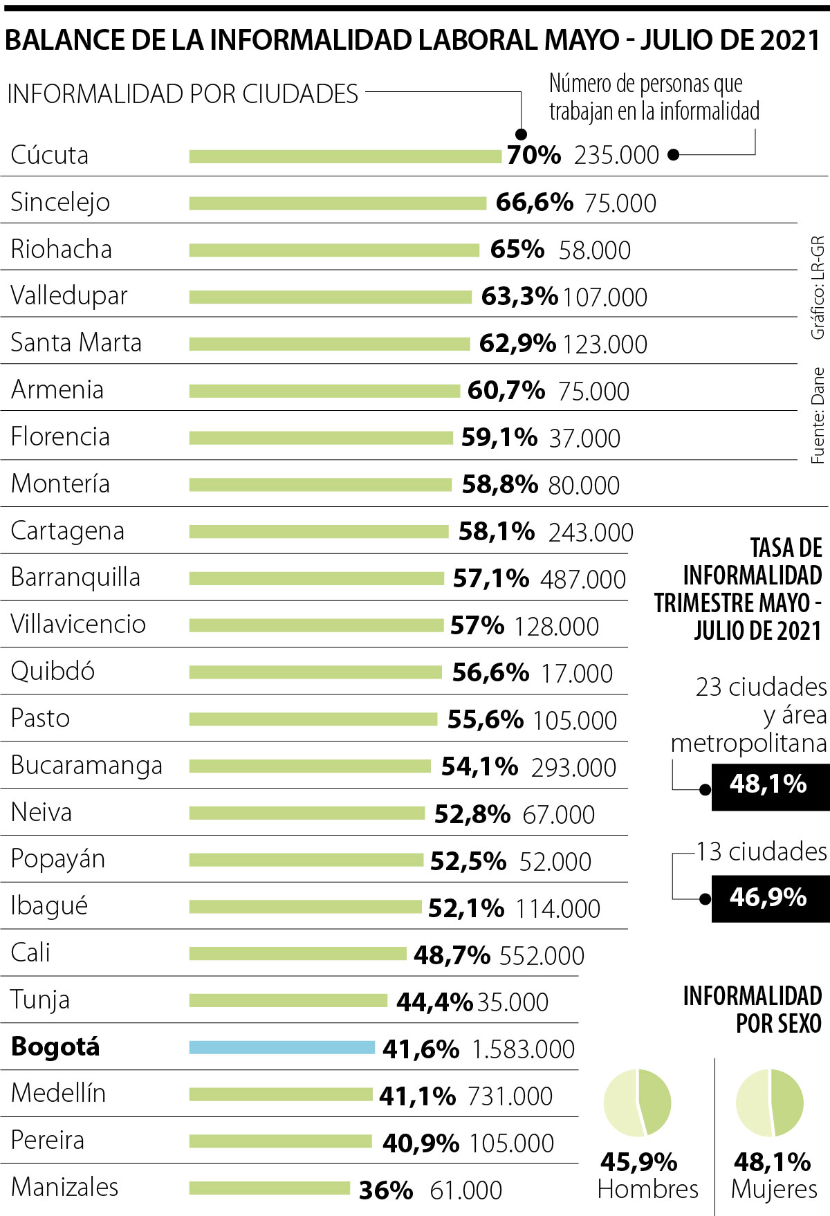 De acuerdo con el Departamento Administrativo Nacional de Estadísticas, Dane, la tasa de informalidad en las 13 principales ciudades en el trimestre móvil mayo - julio de 2021 se redujo levemente a 46,9% desde 47,3% del trimestre abril - junio.