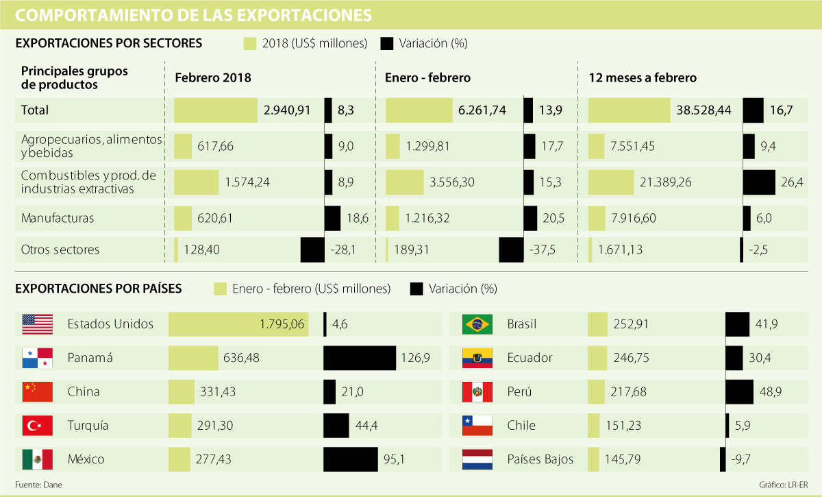 Al mirar los datos de los últimos 12 meses, se ve que las exportaciones han tenido un aumento de 16,7%, y entre enero y febrero, el incremento fue de 13,9% en comparación con el mismo periodo de 2017. Adicional a eso, el Ministerio de Comercio destacó la subida de las exportaciones en el bimestre a varios países como Argentina (158%), Paraguay (133,2%), Canadá (135,4%), Austria (119,7%), Francia (83,4%), Corea del Sur (40,5%), Costa Rica (15,7%) y Estados Unidos (4,6%).
