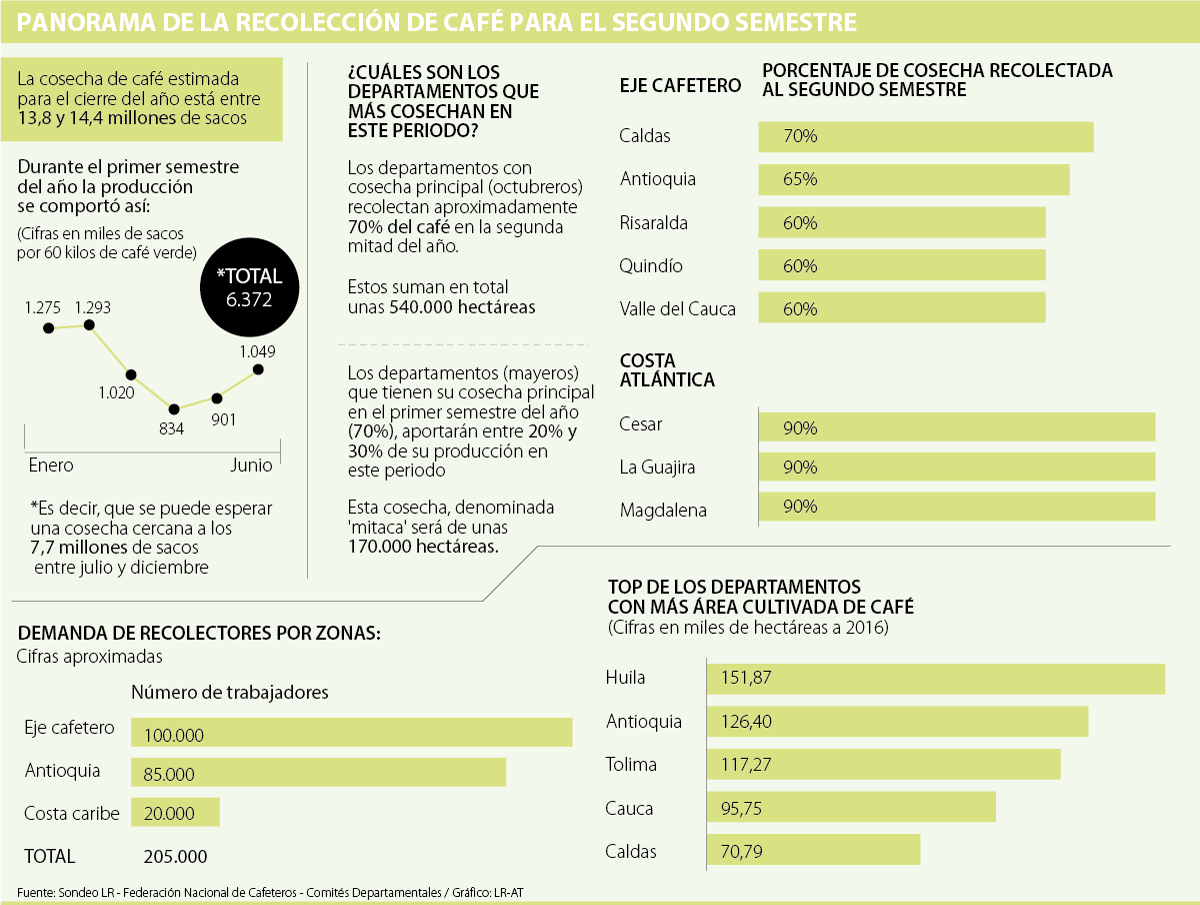 Pero la verdadera pregunta, es si con esta inyección de mano de obra se llegará a la meta de producción para 2017, que según Hernando Duque, gerente técnico de la FNC, está entre 13,8 y 14,4 millones de sacos. Algo que para el directivo es difícil de determinar, porque el número de recolectores requeridos no solo depende de la cifra de sacos esperados en el semestre, que son más de 7,5 millones.