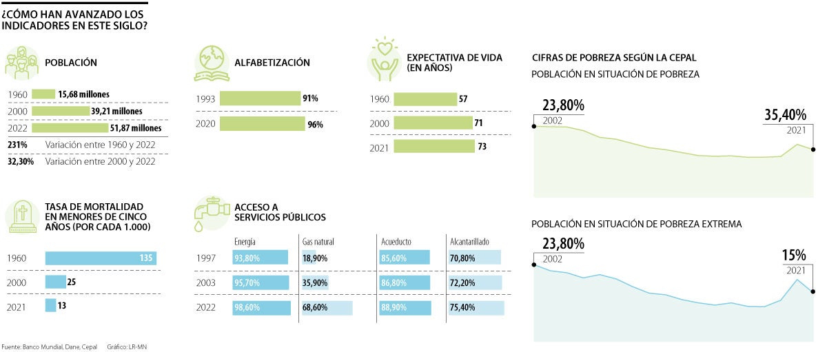 Aunque aún hay temas pendientes, en este siglo Colombia no solo ha avanzado en cuanto al Producto Interno Bruto (PIB), sino que ha mejorado en indicadores de calidad de vida, como el acceso a servicios públicos y educación, más alfabetización, más años de expectativa de vida, menores indicadores de pobreza, entre otros.