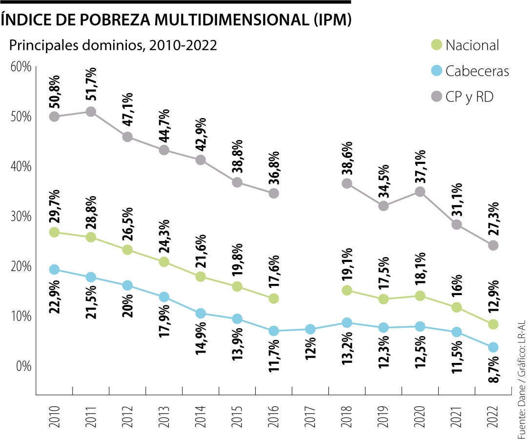 Ayer, el Departamento Administrativo Nacional de Estadística (Dane) reveló el dato del Índice de Pobreza Multidimensional (IPM) para 2022, el cual se ubicó en 12,9%.