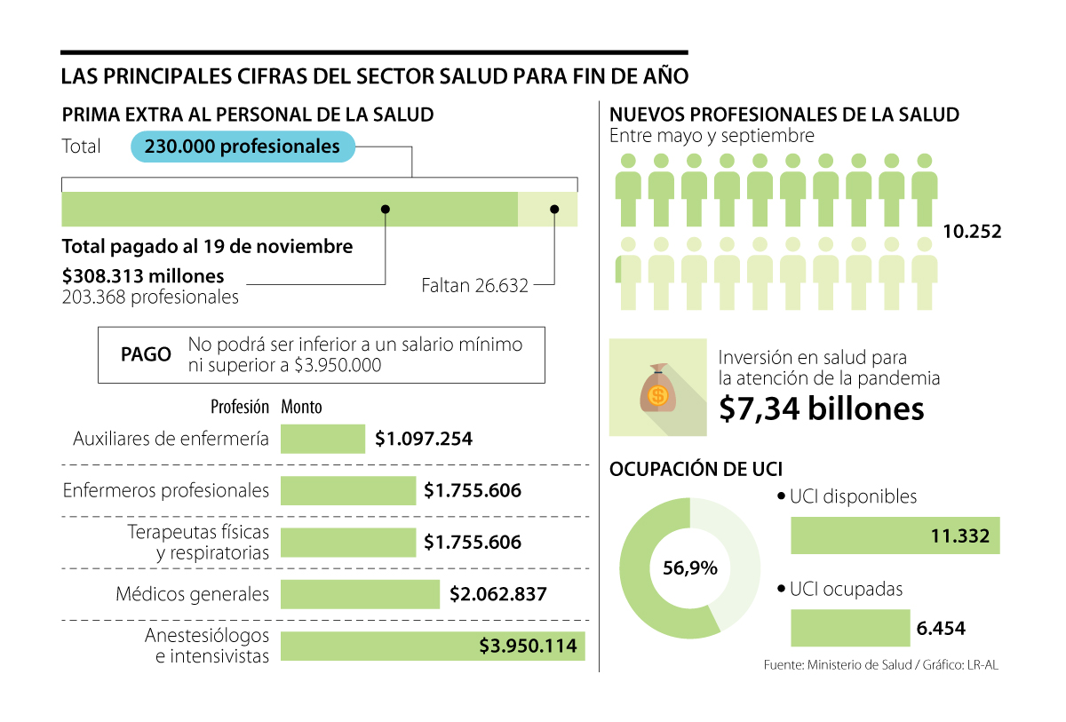 Sin embargo, hasta el pasado 17 de julio la Resolución 1774 de 2020 reguló y definió los parámetros para el pago y, desde el inicio de los giros y hasta el pasado viernes 19 de noviembre, la cartera ya destinó $308.000 millones en esta prima extra a 203.368 profesionales, es decir, falta un promedio de 27.000 empleados por recibir estos recursos.