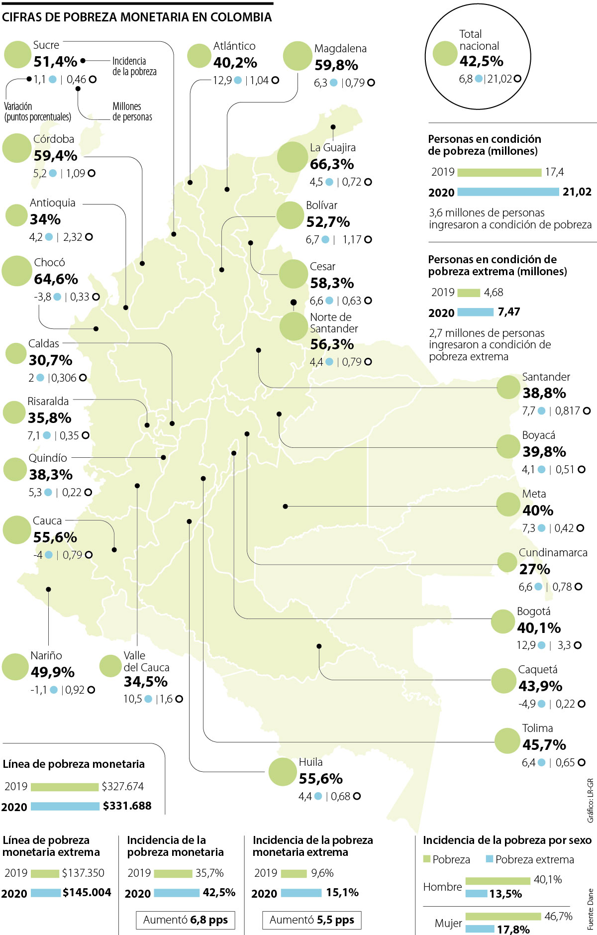 Según cifras del Departamento Administrativo Nacional de Estadística (Dane), el año pasado 42,5% de la población estuvo en condición de pobreza, es decir, hubo un aumento de 6,8 puntos porcentuales (pps) frente a la cifra de 2019 (35,7%).