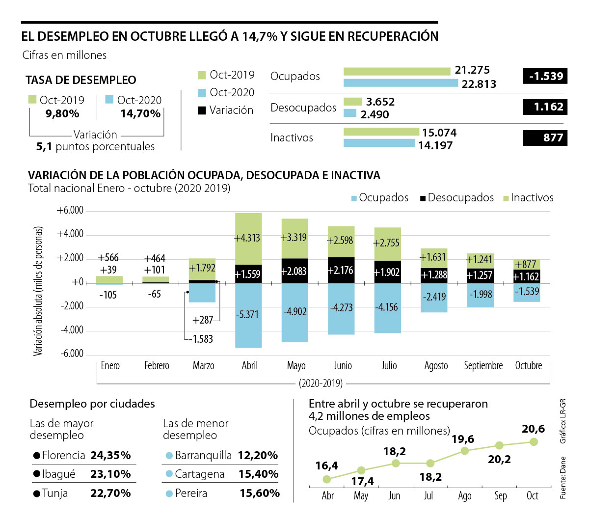 En octubre, el desempleo llegó a 14,7%, pero se notó una recuperación de ocupados, al pasar de 22,4 millones en febrero a más de 20,6 millones para este último corte