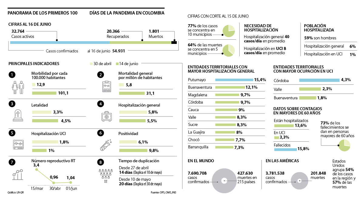 La investigación, que tiene cifras con corte al lunes 15 de junio, indica que de 53.063 casos reportados hasta ese momento, la mayoría estuvieron concentrados en Bogotá, Barranquilla, Cartagena, Cali, Soledad, Leticia, Tumaco, Buenaventura, Villavicencio y Medellín.