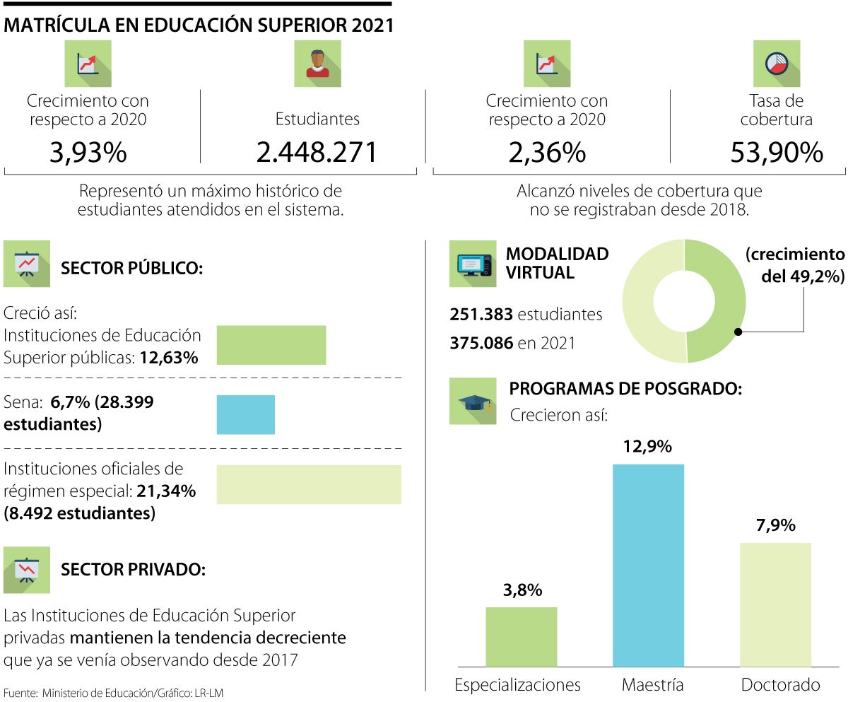 María Victoria Ángulo, ministra de Educación, anotó que el año pasado el país también alcanzó niveles de cobertura que no se registraban desde 2018. En este caso, la tasa se ubicó en 53,9%; denotando un repunte de 2,36% con relación al año anterior (2020).