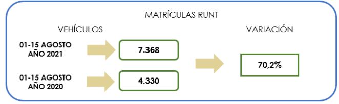 En comparación con los primeros 15 días del octavo mes de 2020, se reporta un crecimiento de 70,2% a 7.368 vehículos nuevos