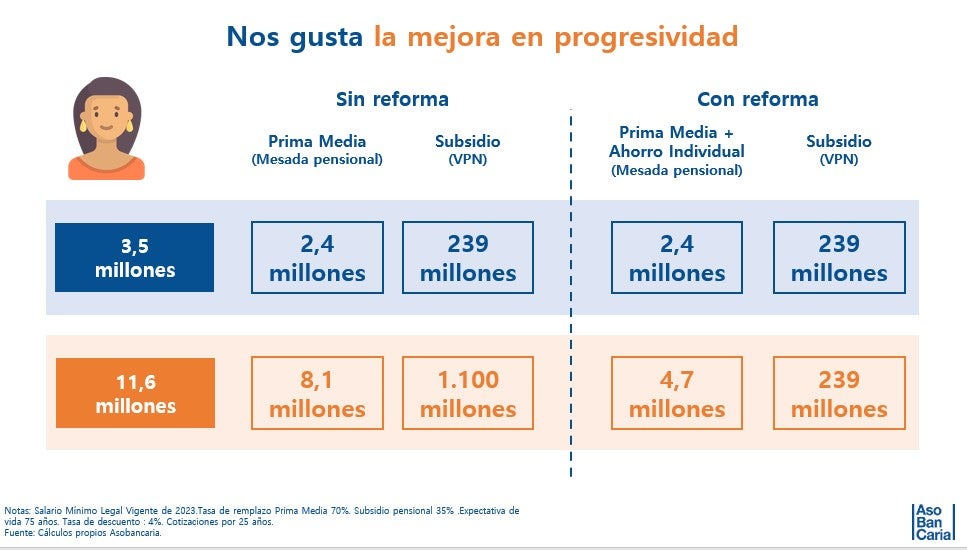 Malagón también resaltó como positivo que se mejora la progresividad, en términos de subsidios a las altas pensiones. Puso como ejemplo el caso de una mujer que durante su vida cotizó por $3,5 millones y una que lo hizo por $11,6 millones. En el primer caso, en el sistema actual, en Colpensiones, se le entregaría un subsidio de $239 millones y, en el segundo, uno de $1.100 millones.