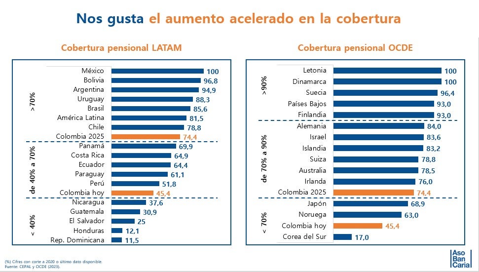 A 2025 se prevé una cobertura de 74,4%, mientras que hoy es de 45,4%. Esto llevaría a que Colombia esté en el segundo bloque dentro de los países de la Ocde, en el grupo con una cobertura entre 70% y 90%.