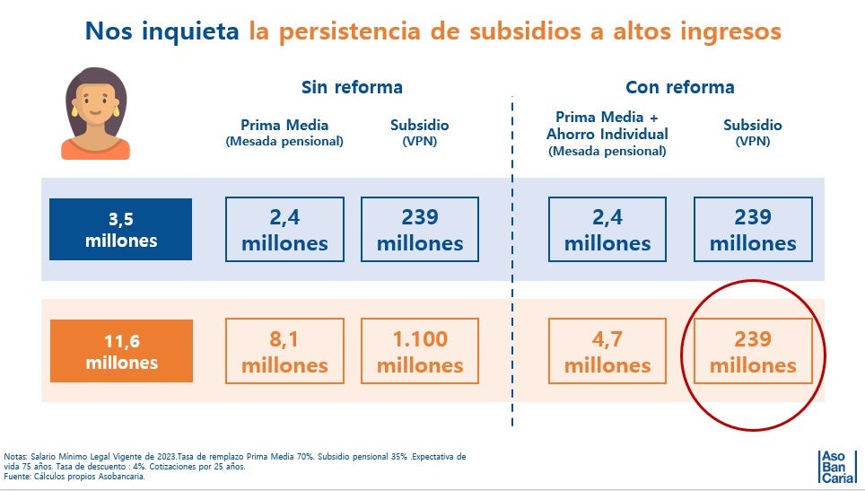 Mientras que con la reforma, el subsidio para la persona que gana $3,5 millones sería el mismo ($239 millones), pero la que gana $11,6 millones recibiría solo $239 millones en subsidios, por el tope de cotizaciones de tres salarios mínimos que se planteó en la reforma.