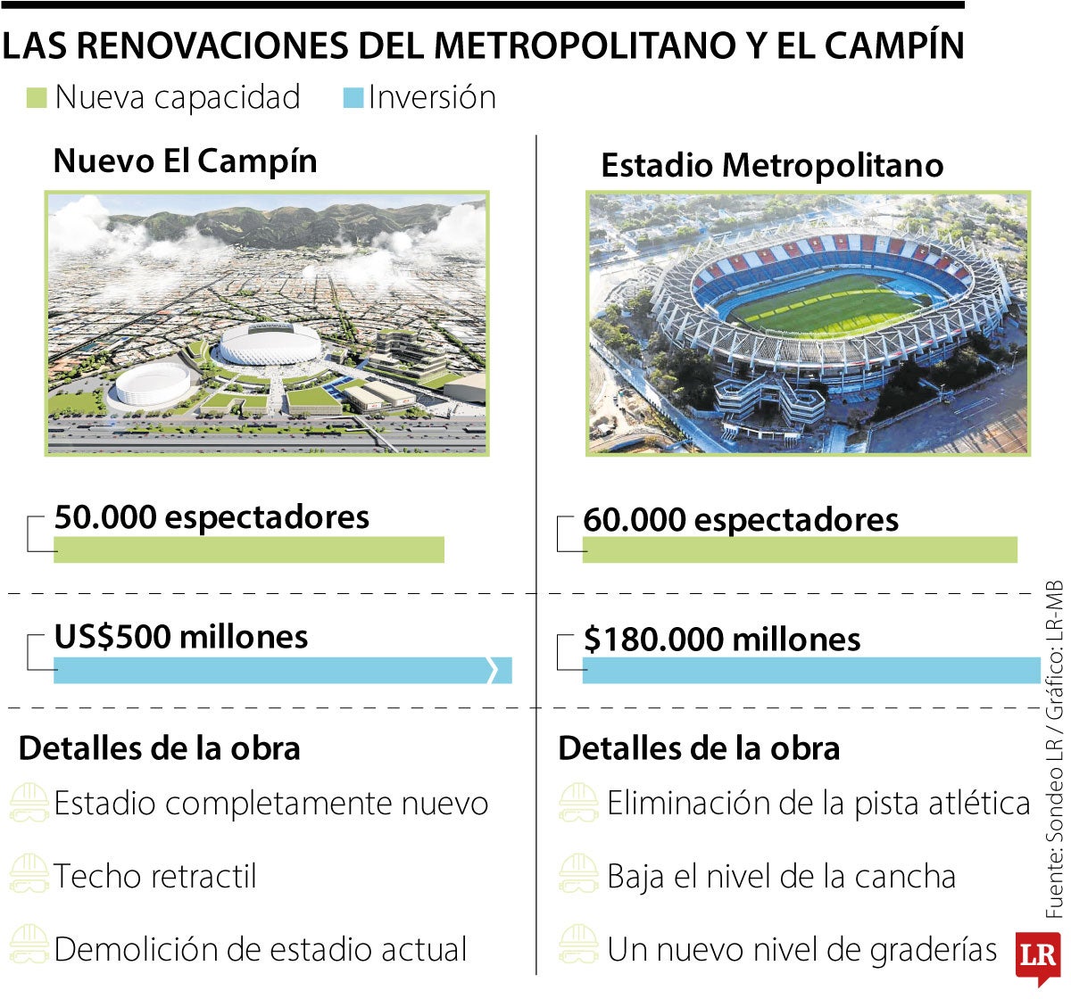 En la capital, se va a estrenar el nuevo El Campín, en una alianza público privada entre las autoridades locales y Sencia, con una capacidad para 50.000 personas. El estadio va a estar ubicado donde actualmente está El Campincito. No se va a tocar la infraestructura actual, hasta que culminen las obras del nuevo coliseo, para luego ser demolida. Allí, irá un centro comercial. El proyecto costará US$500 millones. “Por primera vez en Colombia, el 100% de las sillas ofrecerá la mejor experiencia visual (isóptica recomendada por Fifa), garantizando que incluso la entrada más económica brinda una visibilidad plena y de calidad”, destacó Sencia, promotora de la obra.