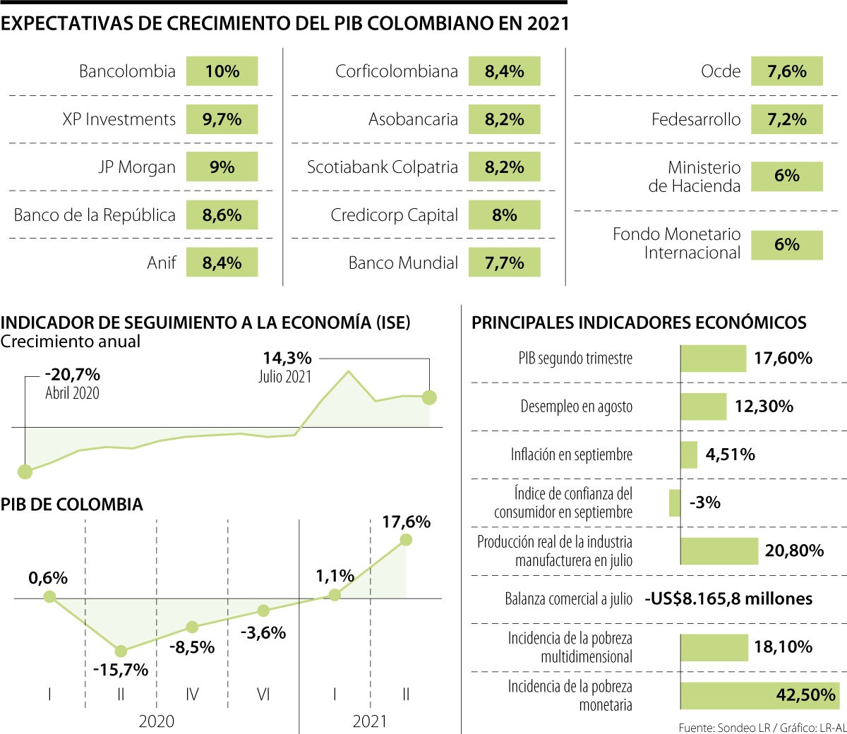 La revisión más reciente en las estimaciones la hizo el Banco Mundial, que ahora prevé que la economía colombiana crecerá 7,7% este año, siendo líder de la región. Mientras que otras entidades multilaterales, como la Organización para la Cooperación y el Desarrollo Económicos (Ocde) y el Fondo Monetario Internacional (FMI), esperan que la cifra sea de 7,6% y 6% respectivamente.