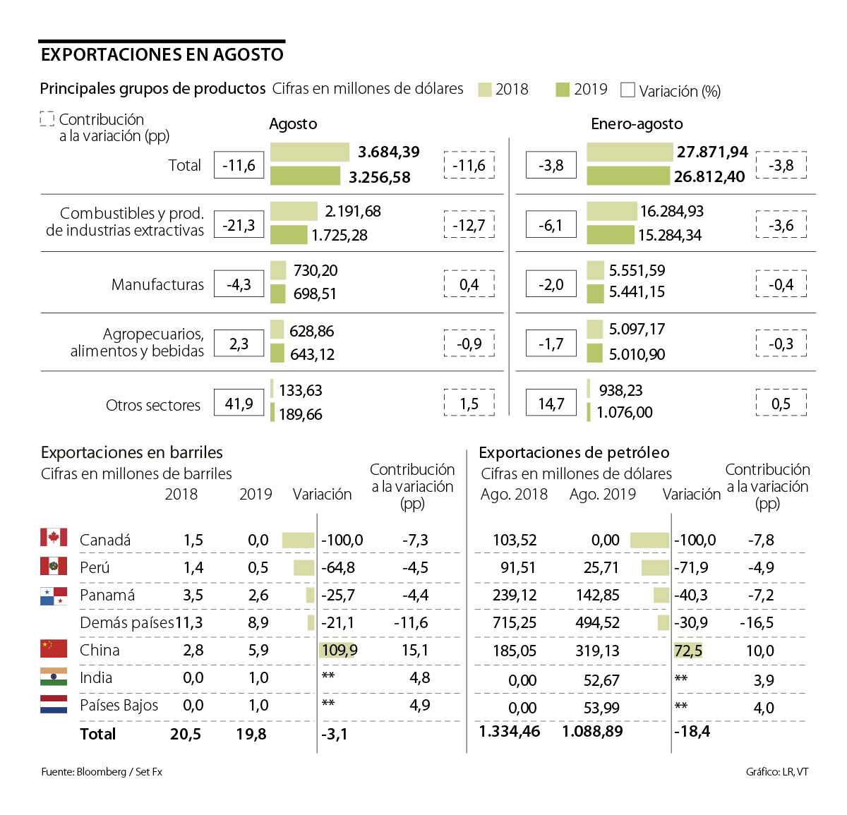 Por otro lado, entre enero y agosto, las exportaciones llegaron a US$26.812,4 millones y registraron una disminución de 3,8% frente al mismo periodo de 2018. En este caso, los combustibles y productos de las industrias extractivas mostraron una caída de 3,6% y totalizaron US$15.284 millones. Las manufacturas (US$5.441 millones) han caído 2% en lo que va del año, mientras que los productos agropecuarios (US$5.010 millones) han caído 1,7%.