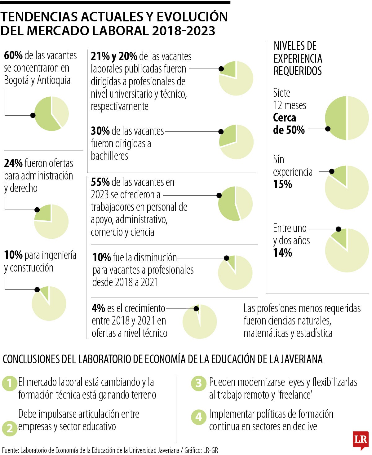 El Laboratorio de Economía de la Educación, LEE, de la Universidad Javeriana analizó datos del portal DataEmpleo del Servicio Público de Empleo, SPE, para evaluar las tendencias y evolución del mercado laboral en los últimos ocho años. El SPE ofrece una muestra relevante de vacantes, y la Javeriana señaló que pueden existir otras no reportadas por las empresas.