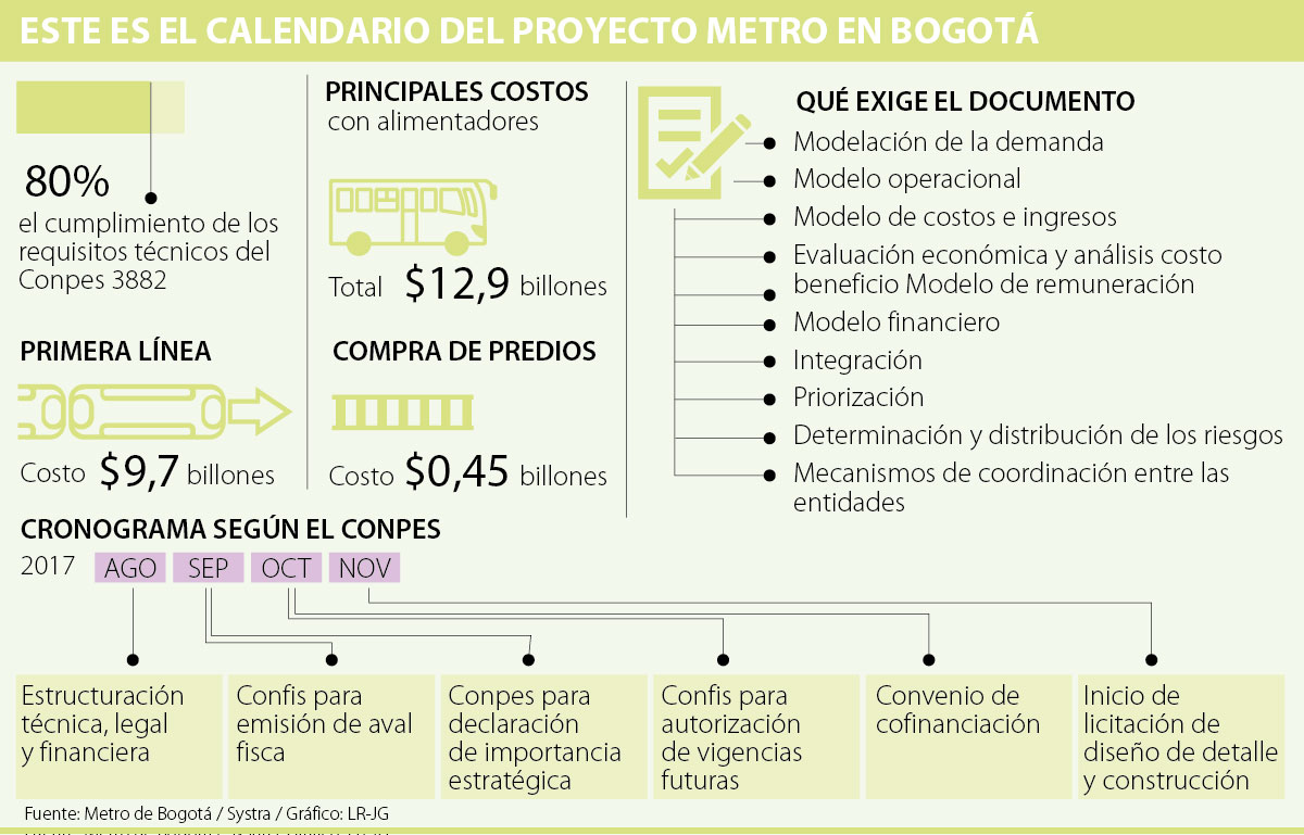 Sin embargo, de acuerdo con el calendario establecido por el documento, estos requisitos debieron ser entregados al DNP en agosto, con lo cual, el tiempo para poder lograr la cofinanciación entre el Gobierno (70%) y la Alcaldía (30%), se aprieta un poco más, pues este convenio debe firmarse en octubre de este año.