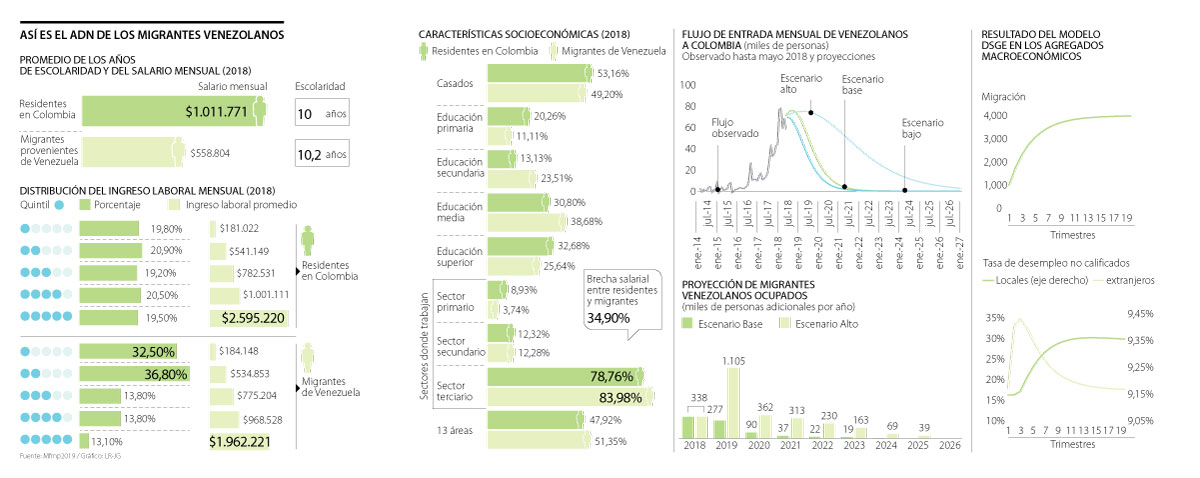 Sin embargo, el análisis de la cartera de Hacienda resalta que las diferencias de ingreso laboral entre estos dos grupos no se explican por sus características socioeconómicas, puesto que sus niveles de escolaridad son similares (de 10 años promedio para los residentes y 10,2 para los migrantes). En ese sentido, el documento se pregunta por qué siguen recibiendo un salario menor: a los colombianos se les paga en promedio $1.011.771 cada mes y a los migrantes venezolanos $558.804 al mes.