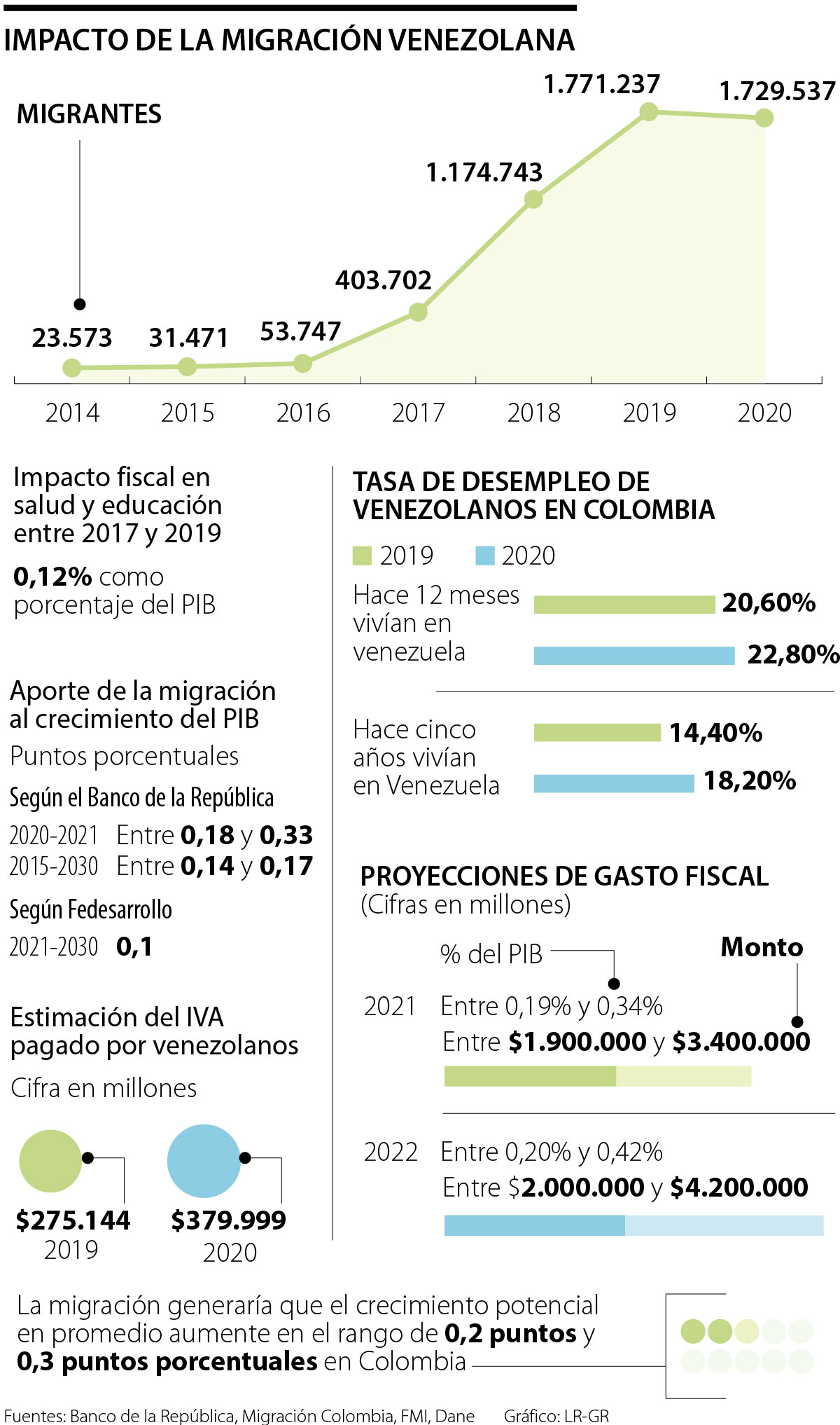 Las estimaciones del Banco de la República del aporte de la migración al PIB son más altas. Según un estudio que publicó el Emisor en 2020, aunque la migración venezolana aumentaría los gastos fiscales de la nación en rubros como los de salud y educación, que serían de $2,04 billones en 2021 y $2,2 billones para 2022 según las proyecciones, también generaría un aumento de entre 0,18 y 0,33 puntos porcentuales en el PIB de este año. Sin embargo, según el reporte, el efecto sobre el PIB disminuirá a largo plazo, alcanzando cifras de entre 0,14 y 0,17 puntos porcentuales sobre el PIB entre 2015 y 2030.