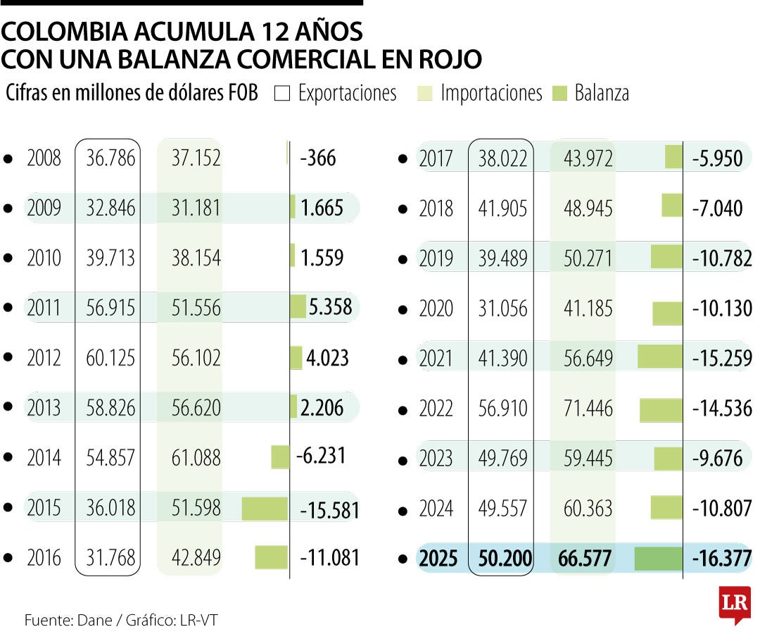 Con importaciones por US$70.502 millones CIF, el año pasado cerró con un déficit comercial total de US$16.377 millones FOB
