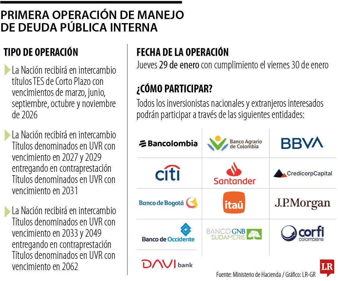 Esta operación se realizará el jueves 29 de enero de 2026, con cumplimiento el viernes 30 de enero de 2026. Los inversionistas nacionales y extranjeros interesados podrán participar a través de Bancolombia, Banco de Occidente, Banco Santander, Bbva Colombia, JP Morgan, Citibank, Davibank, Itaú Colombia, Credicorp Capital, Corficolombiana, Banco de Bogotá, Banco Agrario y GNB Sudameris.