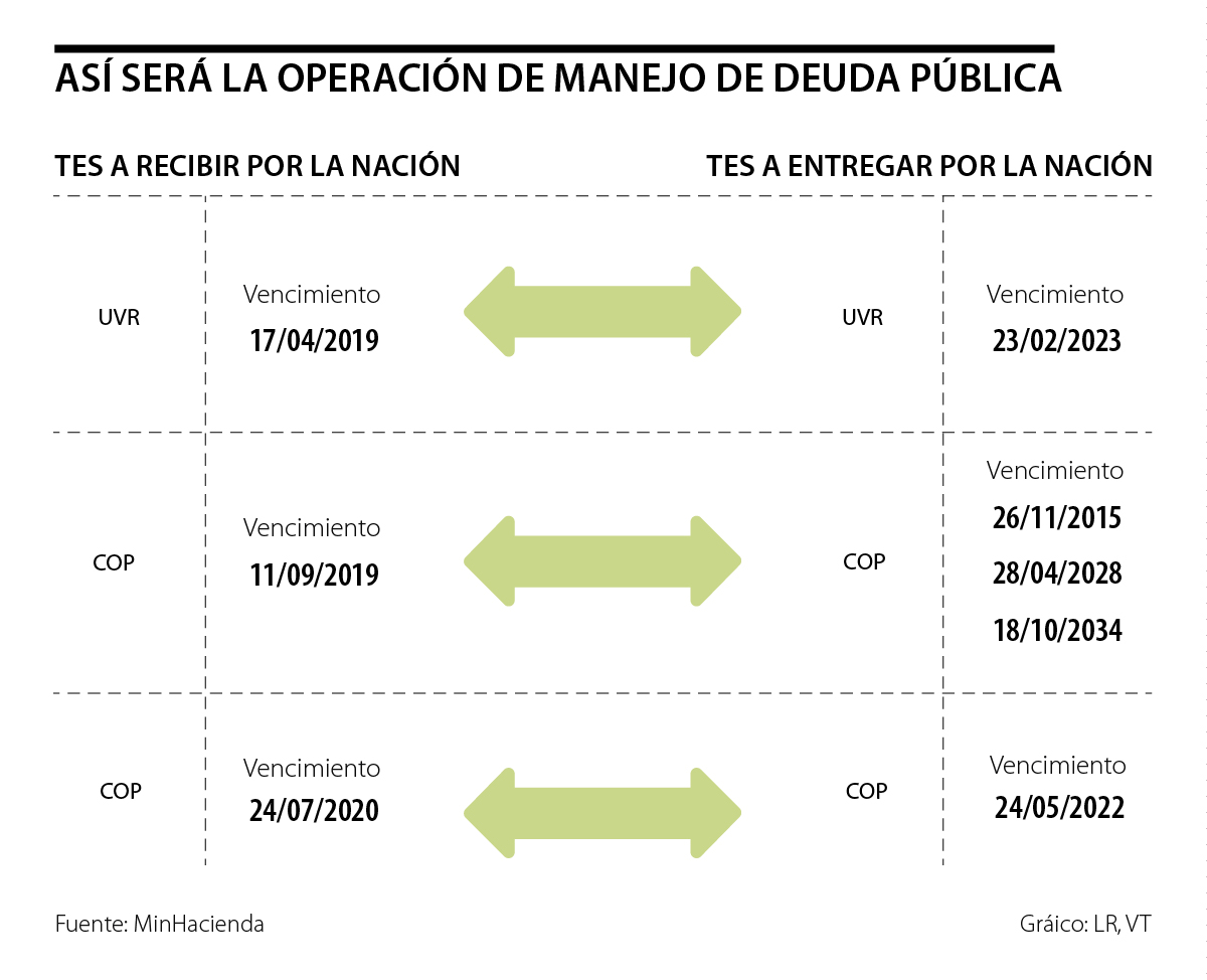 La operación de manejo de deuda pública interna consistirá en el intercambio de Títulos de Tesorería (TES) Clase B, entre la Nación y las entidades participantes en el Programa de Creadores de Mercado. Es por eso que el Gobierno recibirá títulos en intercambio denominados en UVR con vencimiento en 2019 y en contraprestación entregará títulos denominados en UVR con vencimiento en 2023.