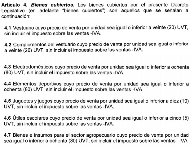 Determina que la exención aplicará a complementos de ropa "morrales, maletines, bolsos de mano, carteras, gafas de sol, paraguas, pañoletas y bisutería"; electrodomésticos, computadores y equipos de comunicaciones; elementos deportivos, incluidas las bicicletas; juguetes y juegos, donde están patinetas y patinetas eléctricas; prendas de vestir de todo tipo; útiles escolares; y bienes e insumos para el sector agropecuario.