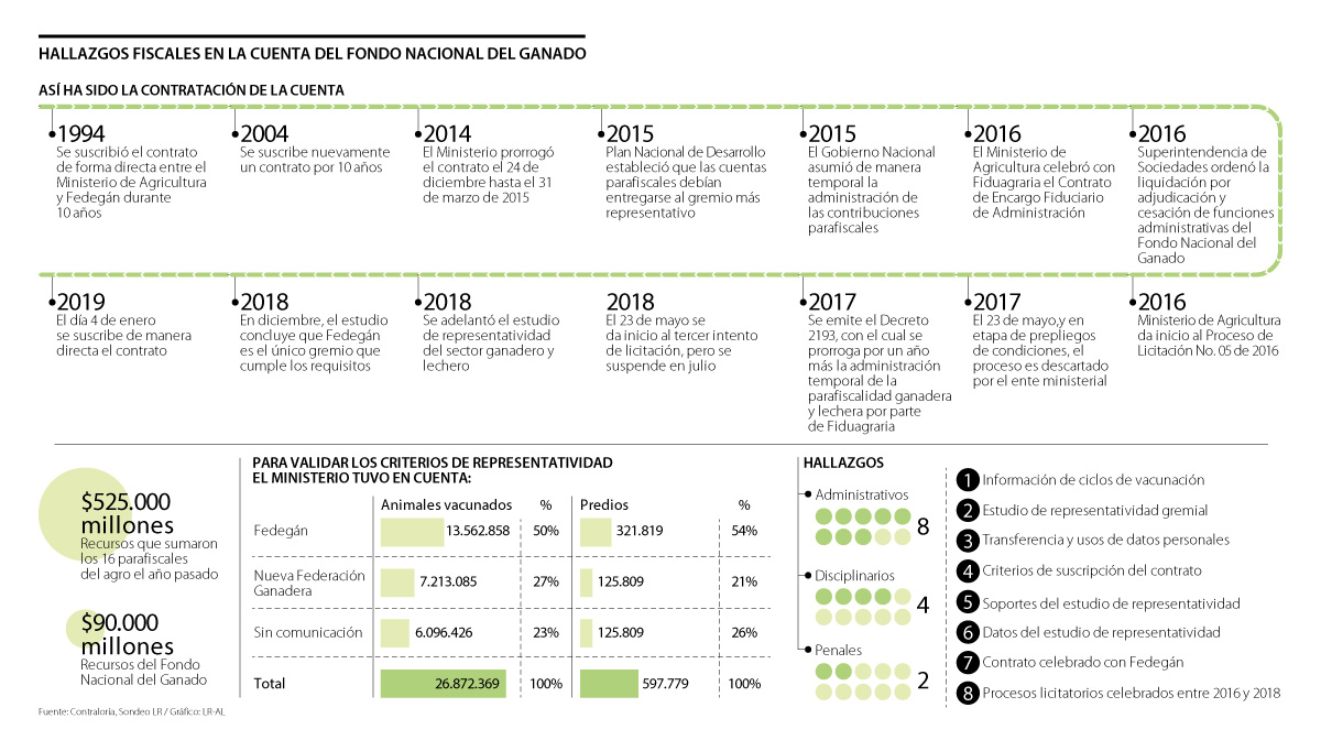 Cuatro meses después de la celebración del contrato entre el Ministerio de Agricultura y la Federación Colombiana de Ganaderos (Fedegan) para la administración del fondo parafiscal del ganado y la leche, la Contraloría General de la República encontró ocho hallazgos en el documento, que no solo obedecen a falencias en los estudios de representatividad gremial, sino, además, muestran que el uso de los datos no fue acorde a la ley.