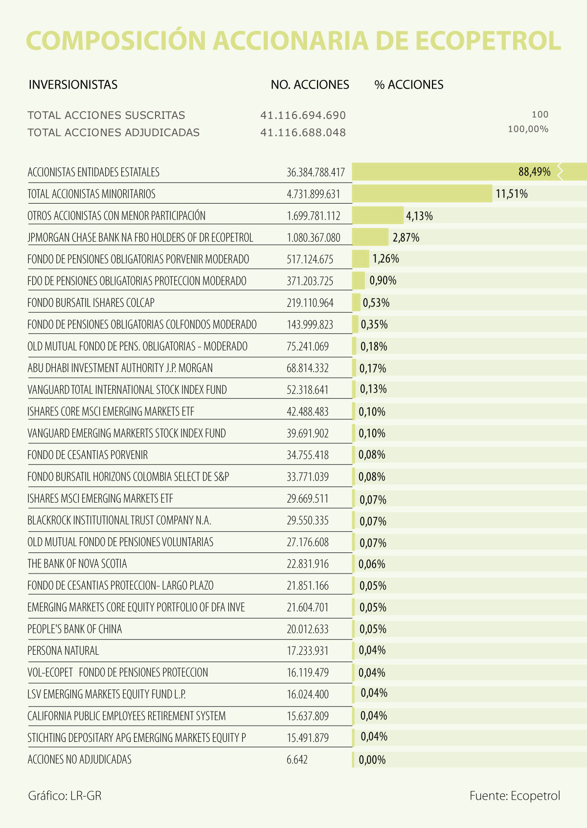 Actualmente, la composición de acciones de Ecopetrol es mayoritariamente del Gobierno, con 88,49% de accionistas de entidades estatales, lo que equivale a 36.384.788.417 papeles y le sigue un 11,51% de accionistas minoritarios. Otro de los participantes es JPMorgan, que cuenta con una participación de 2,87% y Porvenir, que tiene 1,26% del total de acciones.