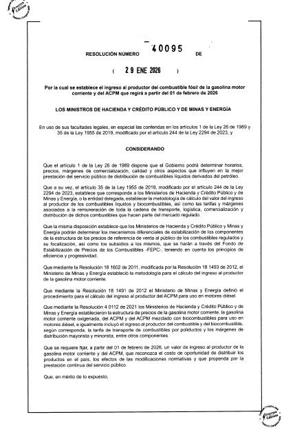 El Ministerio de Minas y Energía expidió la resolución que hace oficial la reducción de $500 por galón en el precio de la gasolina en Colombia a partir del 1 de febrero de 2026, mientras se mantiene estable el precio del diésel en todo el país.