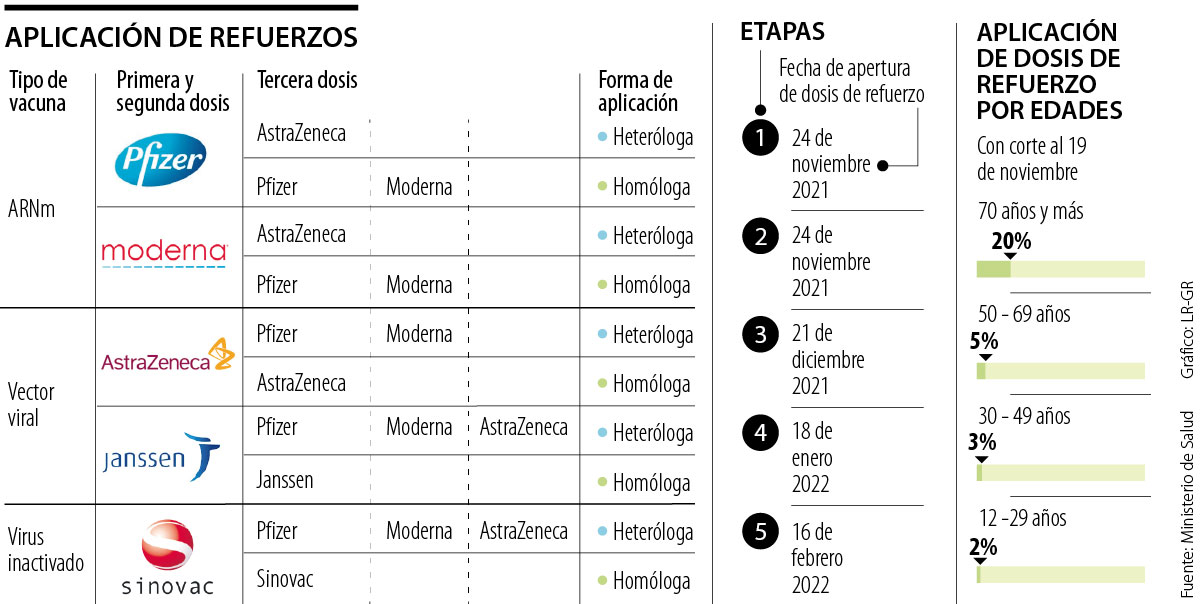 El pasado martes 23 de noviembre, el Ministerio de Salud confirmó que se iniciaría la aplicación de dosis de refuerzo para la población entre 18 y 49 años. Este anuncio se realizó pocos días después de abrir la fase de inmunización para mayores de 50 años que cumplan cuatro meses de finalizado su esquema.
