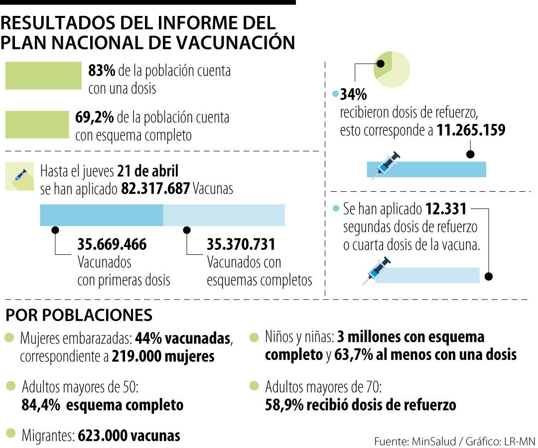 Según datos de la cartera de salud, hasta el día jueves 21 de abril, se han aplicado en el país 82.317.687 de las cuales 35.669.466 corresponden a vacunados con primeras dosis y 35.370.731 a vacunados con esquemas completos. Así mismo, se informó que en este último día analizado por el Ministerio de Salud, se aplicaron un total de 76.509 dosis.