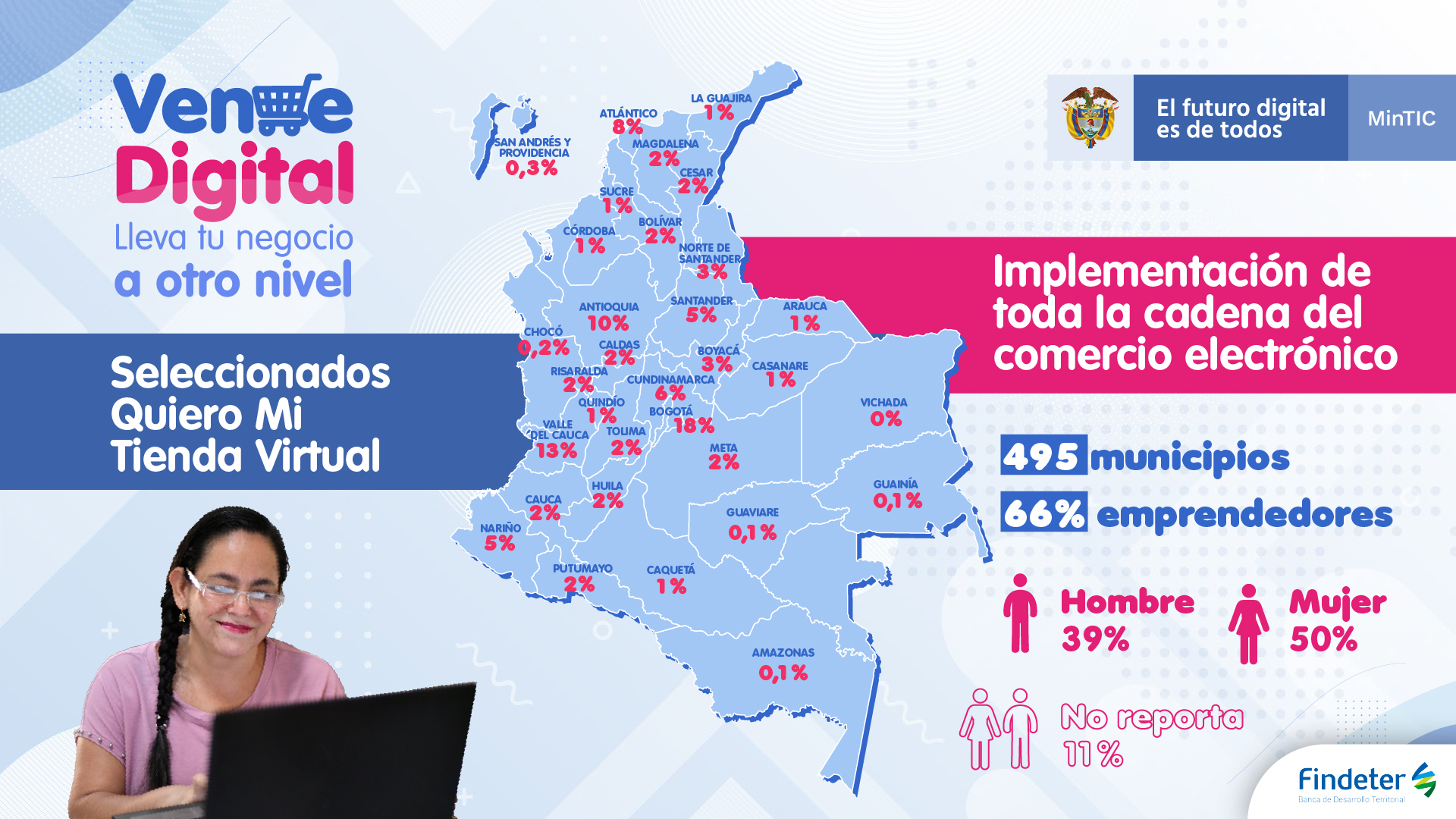 Los seleccionados de Quiero Mi Tienda Virtual, que ya iniciaron el proceso de implementación del programa, se encuentran ubicados en 495 municipios de 31 departamentos. La mayoría de ellos en Bogotá, con 18 % de los beneficiarios; Valle del Cauca, con 13 %, y Antioquia, con 10 %.