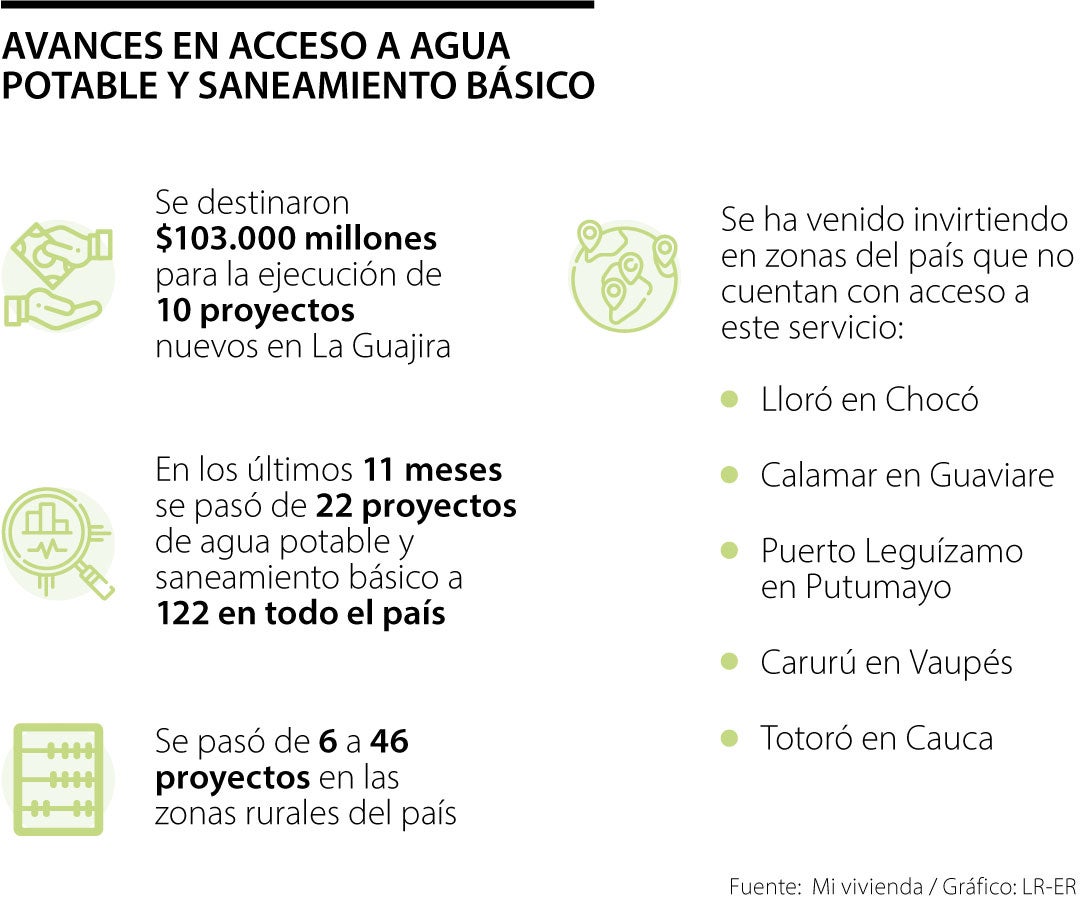 También se informó que "viabilizamos 8.000 conexiones intradomiciliarias, que incluyen la instalación de inodoro, ducha, lavamanos, lavaplatos y lavadero; de redes internas principales y derivadas de acueducto y alcantarillado sanitario, con sus respectivos accesorios, adecuaciones mínimas para garantizar la instalación y funcionamiento de los equipos hidrosanitarios requeridos, la instalación de acometidas de acueducto, la adecuación del espacio existente del baño o la construcción de uno nuevo, según la necesidad, con una inversión de $80.000 millones en 22 municipios del país".