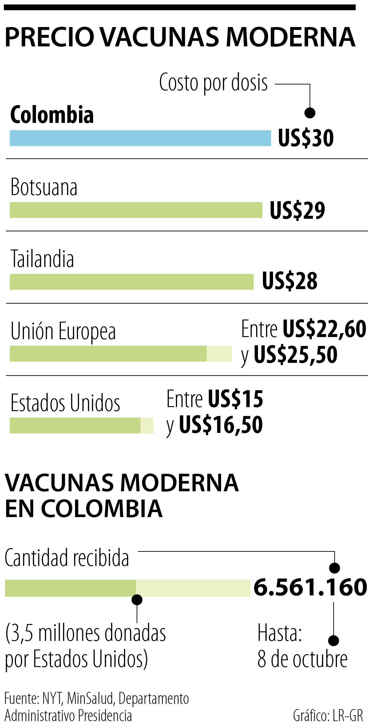 La investigación de NYT mostró que países de la Unión Europea pagaron a Moderna entre US$22.6 y US$25.50 por dosis y a Estados Unidos le vendieron estas vacunas por US$15 o US$16,50, mientras que países con ingresos menores se les cobró un precio más alto, por ejemplo el precio para Botsuana fue casi US$29, para Tailandia costó US$28, y según el medio estadounidense, a Colombia le costó US$30 cada dosis, pero en ese precio ya estarían incluidos los costos logísticos.