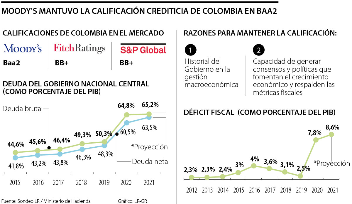 Contrario a las decisiones de Fitch Ratings y Standard & Poor’s, ayer Moody’s Investor Service reafirmó las calificaciones de emisor de largo plazo en moneda local y extranjera, y de deuda senior no garantizada del Gobierno de Colombia en Baa2, con lo que el país mantiene el grado de inversión con esta firma.