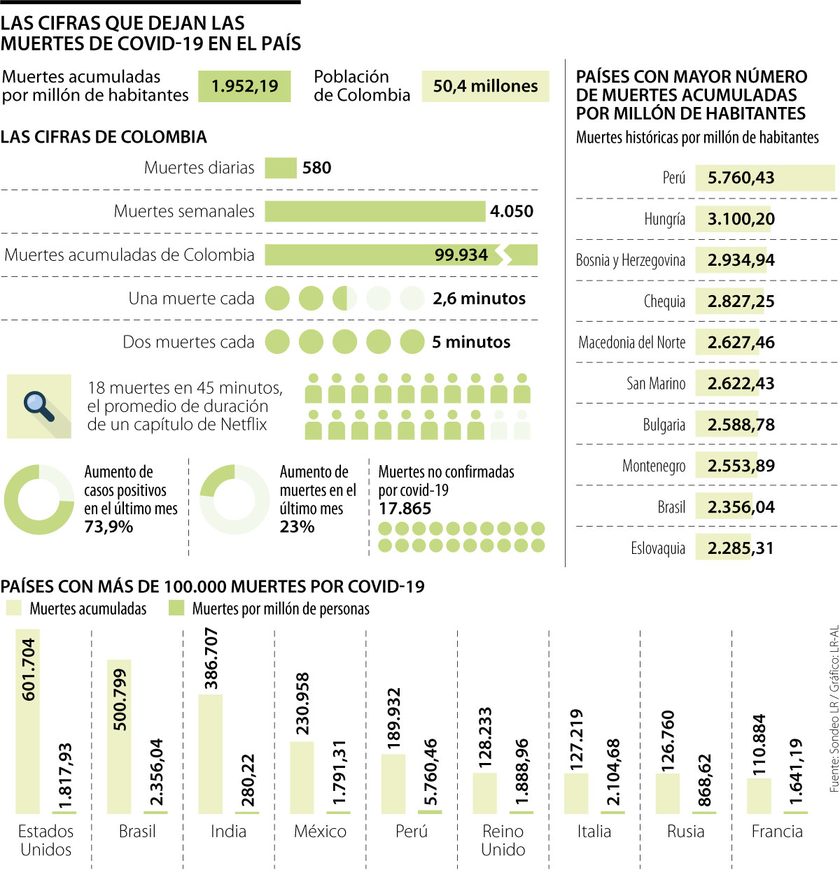 En las últimas dos semanas se ha batido récord de muertes diarias y con la cifra total histórica de 99.934 fallecidos, el país se acerca los 100.000 una cantidad que a nivel internacional solo han superado nueve países. Este top 10 lo lidera Estados Unidos, con 1,817.93 muertes por millón de habitantes. Le siguen Brasil, India, México, Perú, Reino Unido, Italia, Rusia y Francia. Colombia entraría a la lista con 1.952,19 muertes por millón de habitantes, es decir, una mayor cantidad de defunciones en comparación con la población de países como Estados Unidos, India, México, Reino Unido, Rusia y Francia.