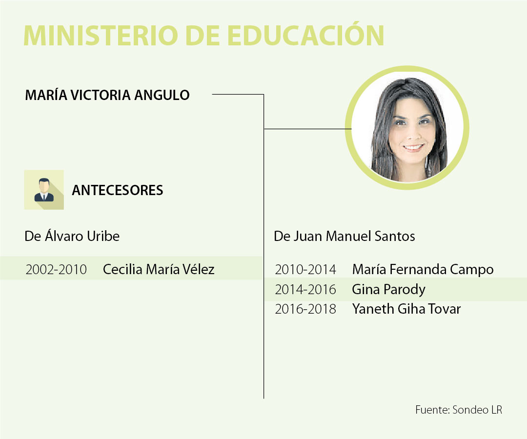 Posteriormente, Duque informó que María Victoria Angulo sería su ministra de Educación. Ángulo es actualmente la secretaría de Educación del Distrito, nombrada por el alcalde Enrique Peñalosa, por lo que dejará el cargo que ocupa hace cerca de año y medio en la Alcaldía Mayor de Bogotá para reemplazar a Yaneth Giha Tovar en un cargo que desde 2002 ha estado en manos de mujeres cuando asumió Cecilia María Vélez.