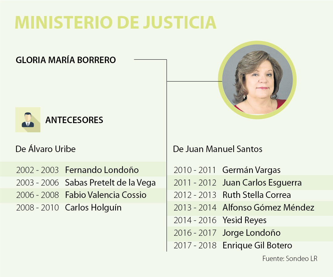 Otra mujer que estará en el gabinete de Duque será la abogada huilense Gloria María Borrero como ministra de Justicia. Es "una mujer con mucha preparación, con un gran conocimiento de la problemática de la justicia de nuestro país y esperamos trabajar con ella en los próximos años”, trinó el nuevo Presidente.