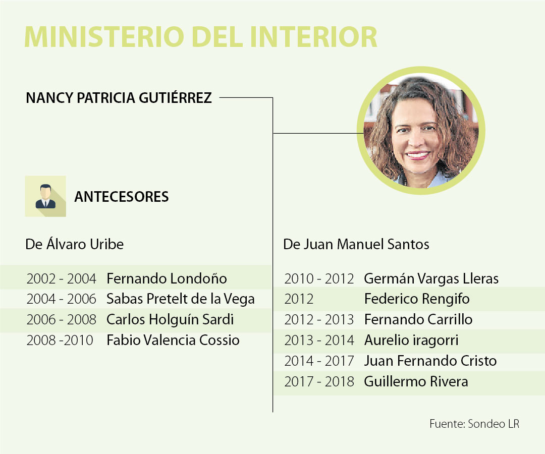 Tras ganar las elecciones, la primera jefe de una cartera nombrada fue Nancy Patricia Gutiérrez en el Interior. "Colombia tendrá por primera vez una ministra del Interior (...) hecha a pulso, que ha sido presidente de la Cámara de Representantes", trinó el presidente Duque.